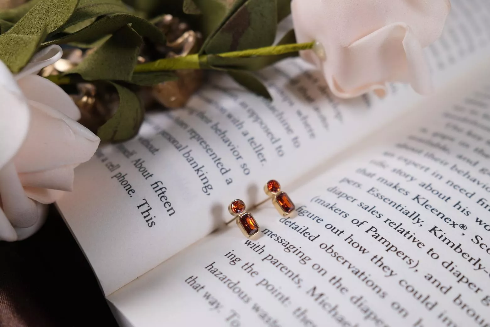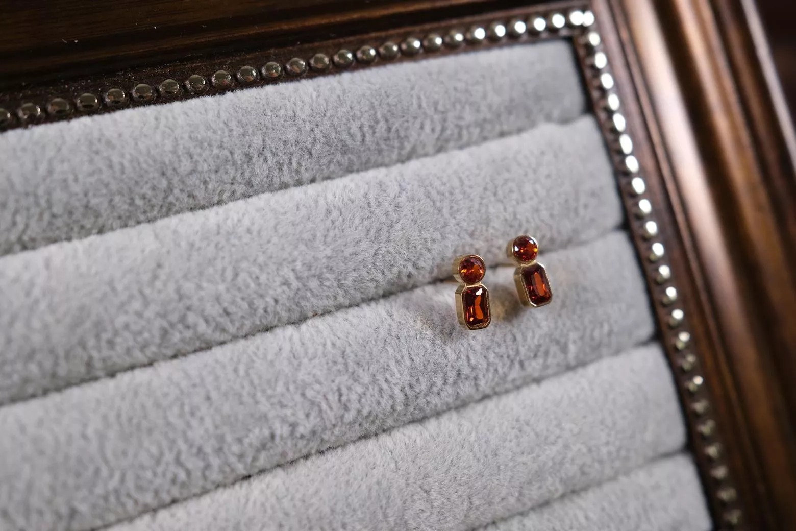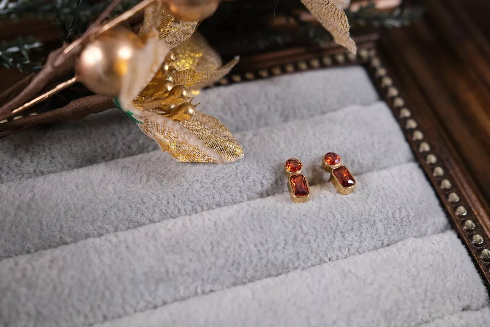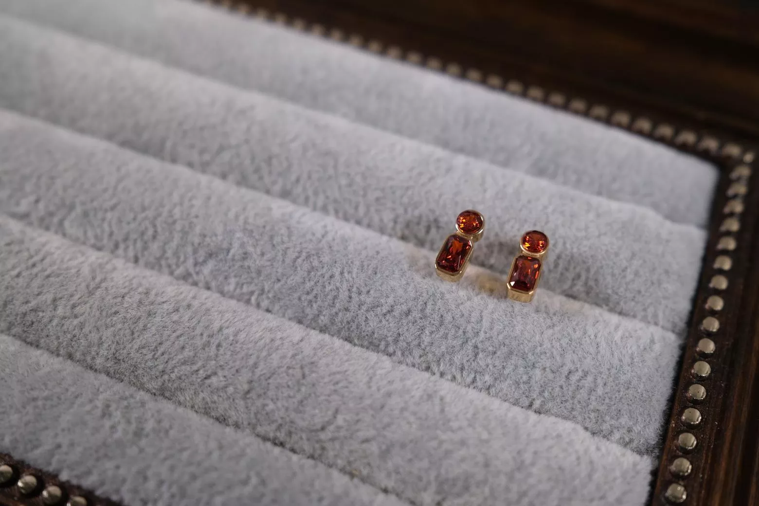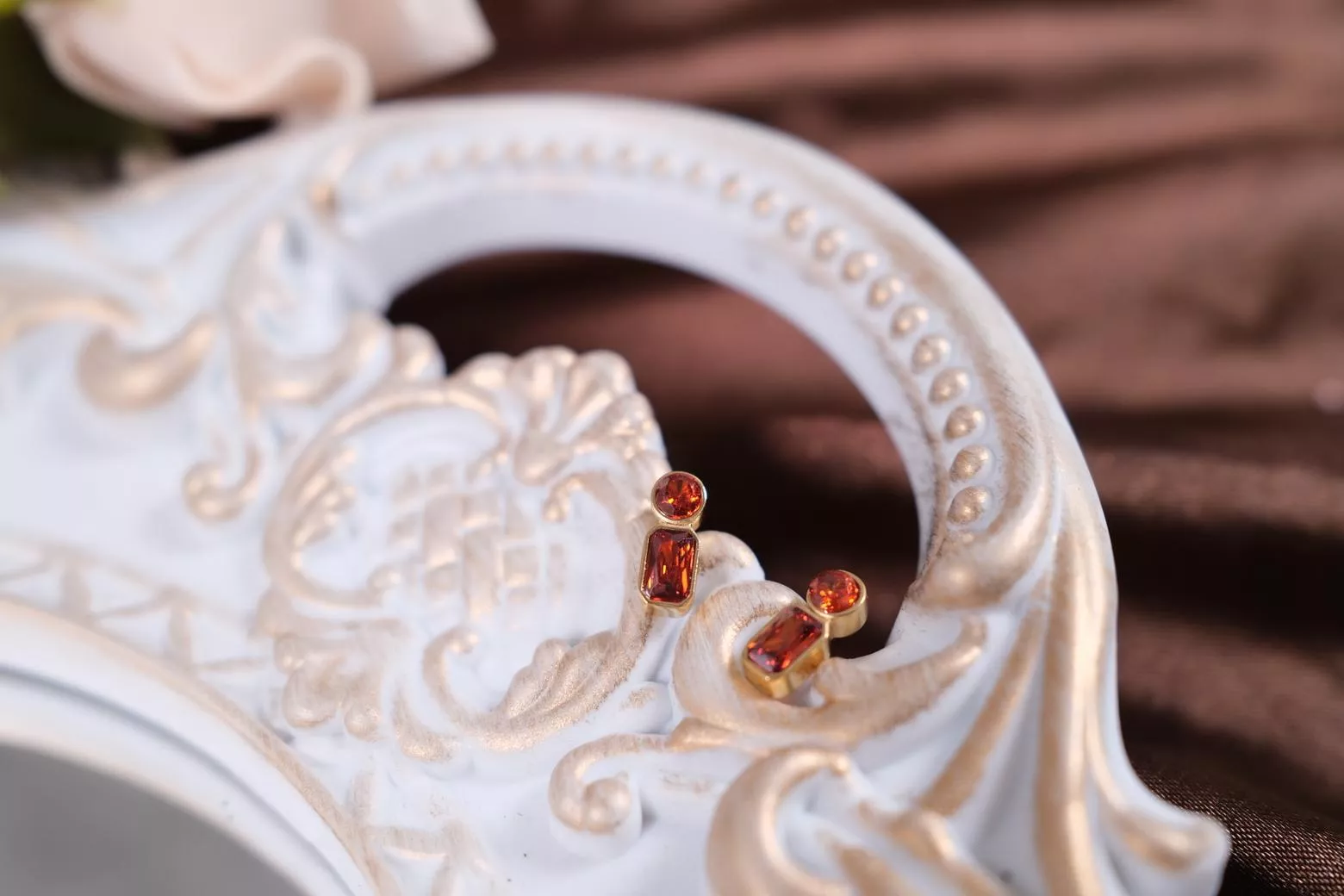 以飽和深紅鋯石構成雙層結構,圓形與長方形的經典組合營造出穩重又迷人的層次感,讓妳的耳際成為眾人目光的焦點。
