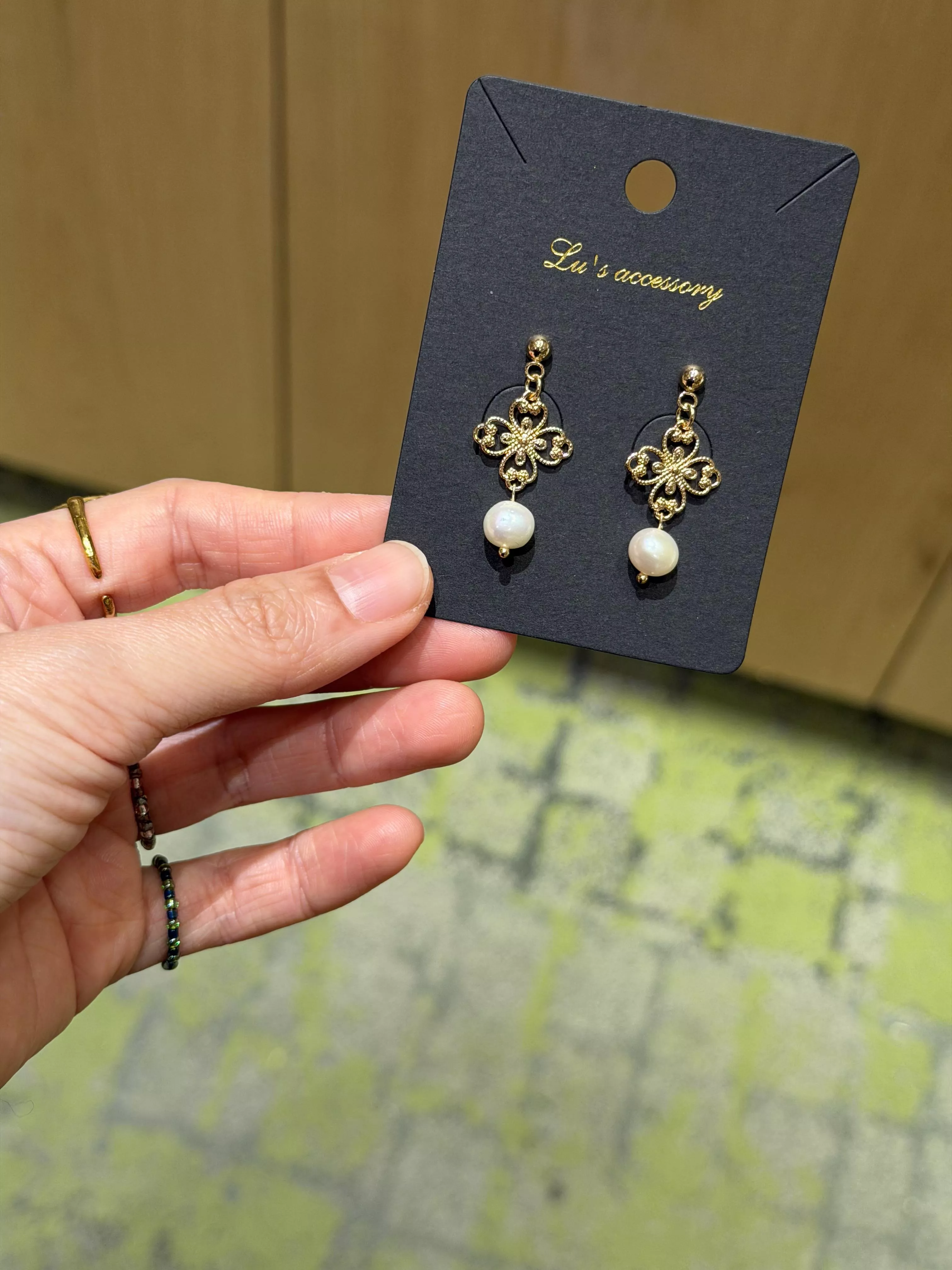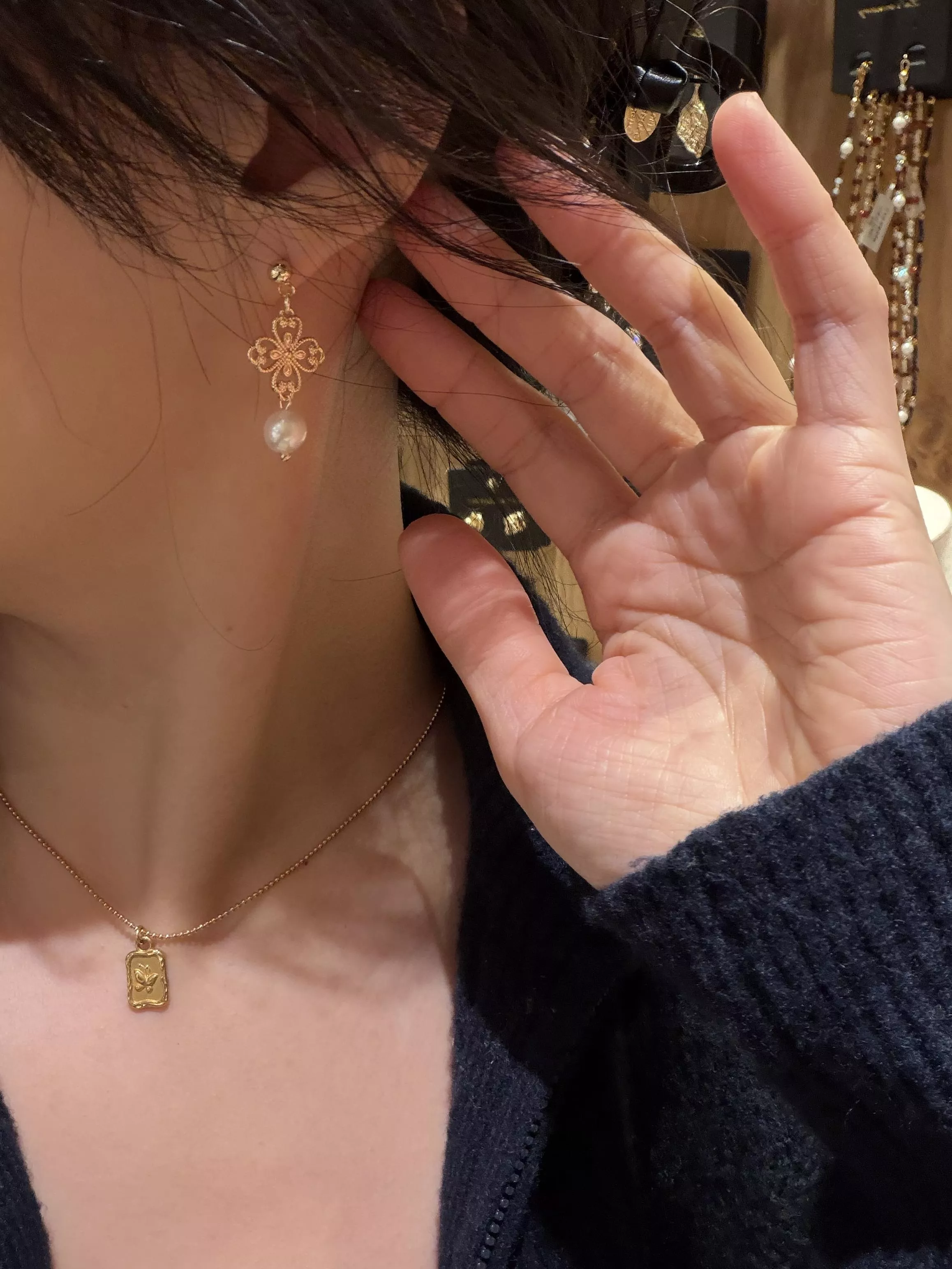 溫潤色澤勾勒出幾何對稱美學,下方墜著一顆微潤的淡水珍珠,宛如宮廷舞會中不經意流露的貴氣。